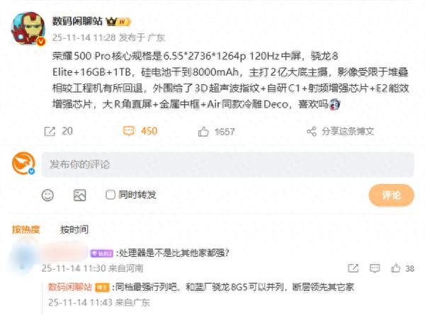 硬件配置方面,荣耀500 Pro将搭载骁龙8至尊版芯片,有网友询问:“处理器是不是比其他家都强?”,该博主回复称,同档最强行列,可以和蓝厂(vivo)的第五代骁龙8并列,断层领先其它厂商。影像是该系列的升级重点,将全系标配2亿像素主摄,搭载AiMAGE影像算法调校,荣耀500 Pro更将进一步搭载2亿像素潜望式长焦镜头,并支持高倍数光学变焦。此外,该机全系或将内置8000mAh超大容量电池,支持80W有线快充,而荣耀500 Pro还将有望支持50W无线充电。